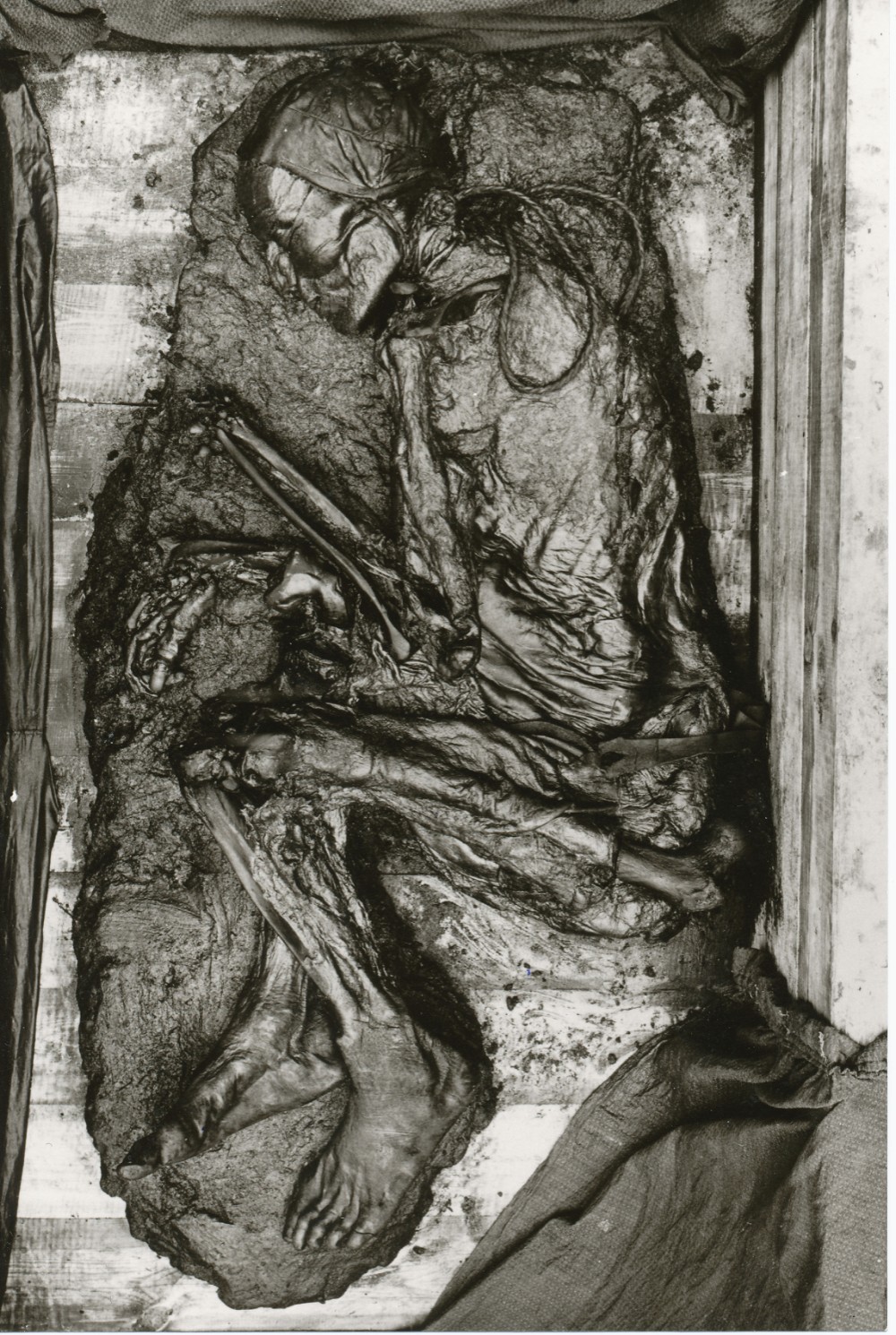 Eight days after the crate with Tollund Man had been sent off, it arrived at the National Museum. Amidst the haste no accompanying description had been enclosed, leaving the National Museum in doubt as to the intentions with it. Regardless the crate was opened and an excavation began. The person given the task of carrying out the excavation was conservator Knud Thorvildsen who had been responsible for three other excavations of bog bodies in the Borremose. The work took place in open air, in the courtyard of the National Museum, and every by-passer was immediately stricken by the fantastically well-preserved face. In the meantime a letter arrived from barrister Otto Bisgaard from Silkeborg Museum expressing interest in exhibiting the find conserved in its entirety at Silkeborg Museum. The head of the National Museum’s prehistoric Department, senior curator Therkel Mathiasen advises against this as he believes it would be too “macabre”. Instead he offers a conservation of the well preserved head. After the body had been comprehensively photographed following complete excavation at the National Museum, it was transported to Bispebjerg Hospital where it was x-rayed. Upon the completion of an autopsy of the body the head was dismembered from the body in order to preserve it for the future.