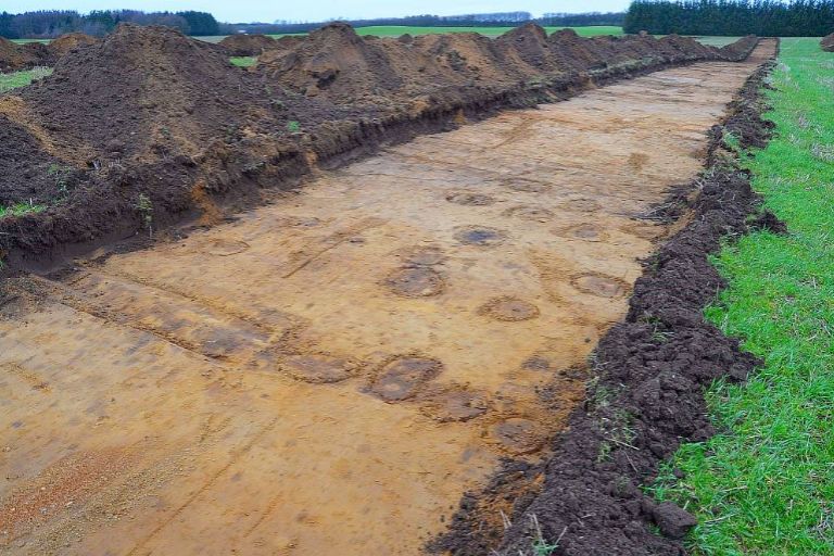 Når arkæologerne skal forundersøge et givent område, sker det ved at mulden bliver gravet af i søgegrøfter hen over området. Anlæg og fund i søgeg